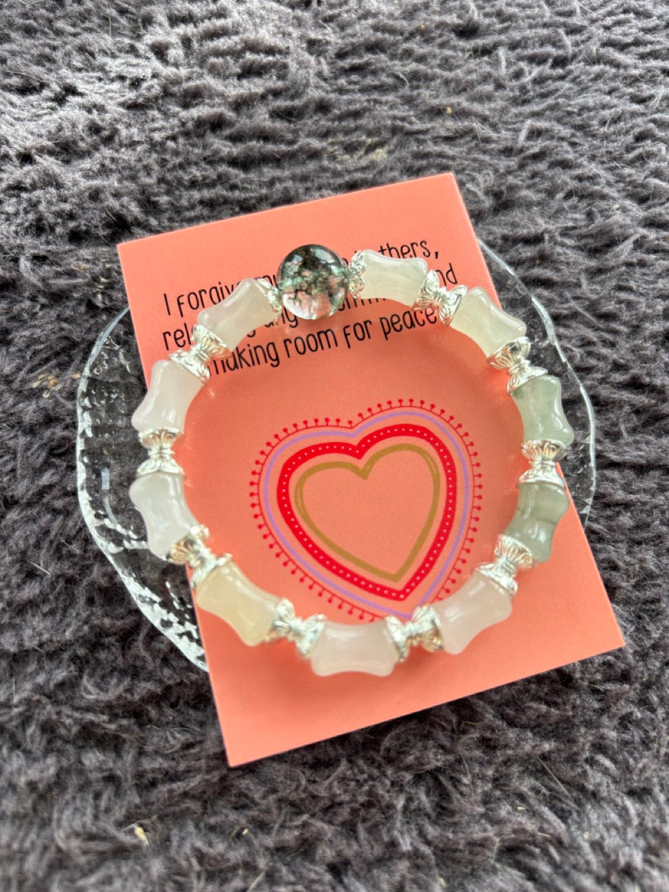 Invite growth, balance, and renewal with this Bamboo Shape Jade and Green Phantom Crystal Bracelet with Silver Colour Decoration. Designed with natural elegance, this bracelet combines the steady energy of jade with the transformative power of green phantom crystal, finished with a radiant silver accent.