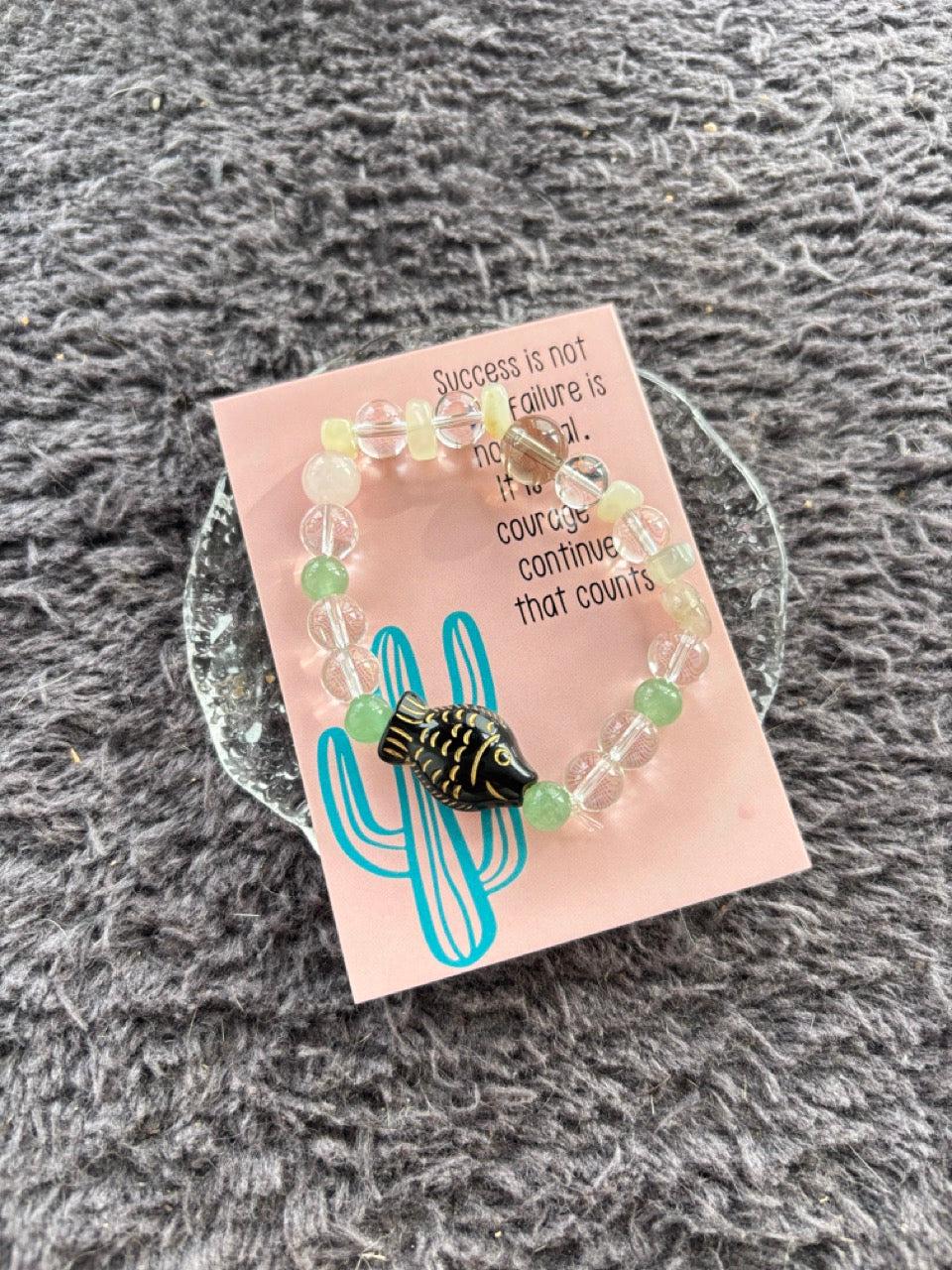 Bring playful energy and abundance into your life with this Jade, Crystal, and Citrine Bracelet with Fish Decoration. Featuring a charming fish blowing bubbles, this bracelet combines the powerful energies of three healing stones with a whimsical, joyful design.
